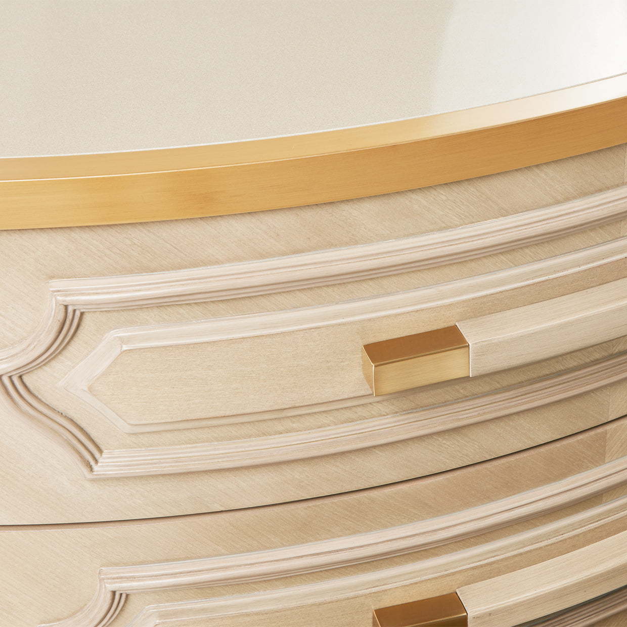 - Elegant tufting, gentle curves, and bronze trim make a statement of refined taste and sophistication.
