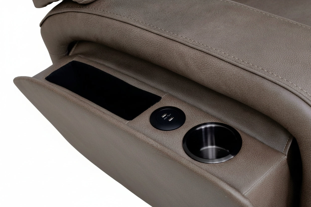 • Hidden arm pocket on both sides featuring a cupholder, USB-C, USB-A, and storage that can be pushed back into the arm when not needed