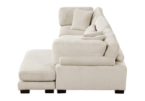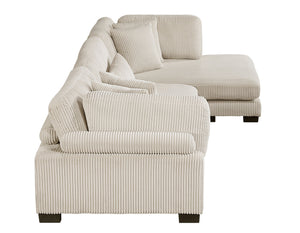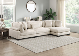 Configurable to your available space, this collection allows for the addition and detachment of pieces for a customized seating experience. The 3-piece sectional configuration consists of one corner unit paired with one armless chair, and a chaise. The beige corduroy fabric upholstery creates a plush expanse for a soft touch experience.